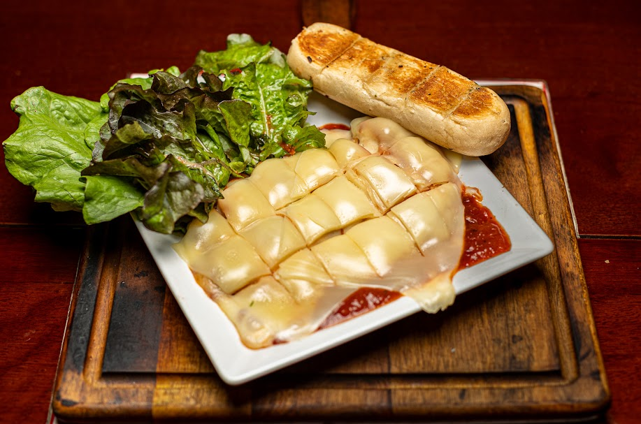 Bife frango a parmegiana, com molho especial da casa e muito queijo. Acompanhado de pão de alho e salada de folhas verdes.